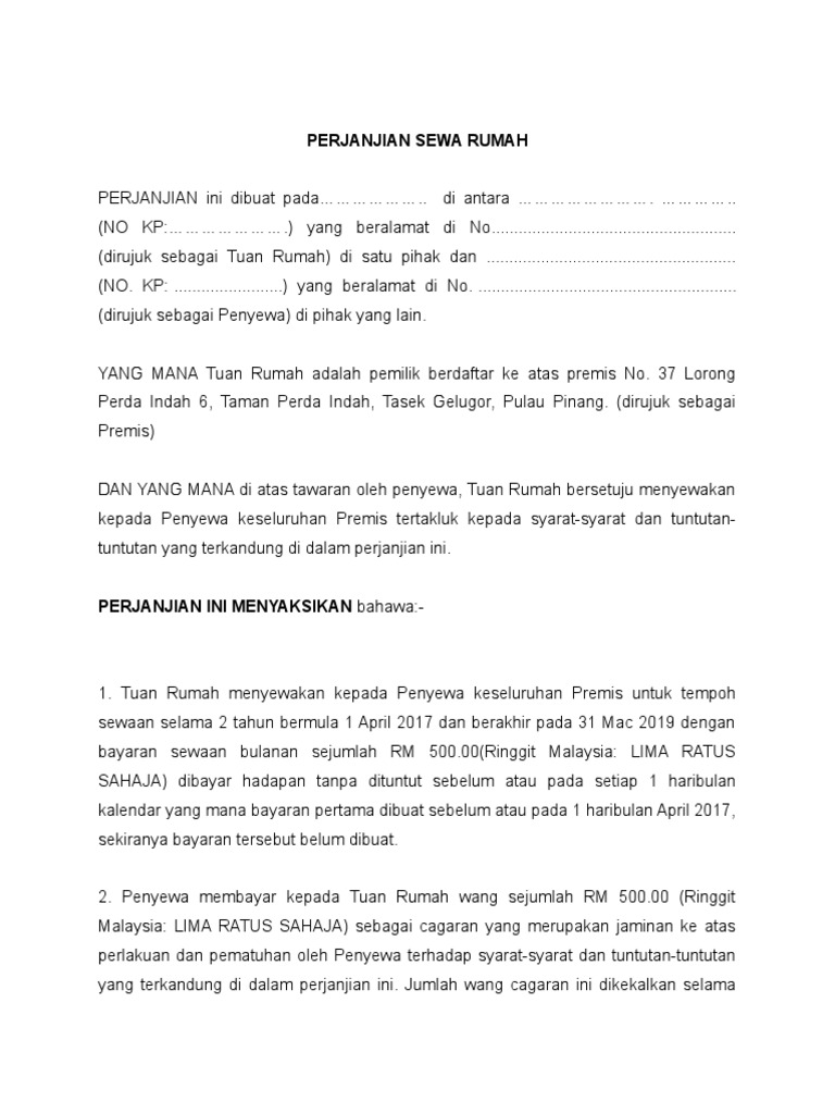 Surat perjanjian ini bertujuan untuk mengingatkan antara kedua belah pihak atau lebih untuk melakukan sesuatu hal. Perjanjian penyewaan rumah untuk kediaman c-12-29 jalan damai mewah 2 pangsapuri damai mewah b taman damai mewah 43000 kajang selangor diantara nur hanan binti manan dan mohamad syafiq razalie bin mohd lazim pada tarikh 30 ogos 2018 mukasurat 2 borang maklumat penyewa nama. Atleast kedepan apa-apa terjadi anda ada hitam putih di kertas.